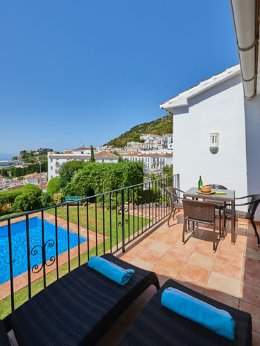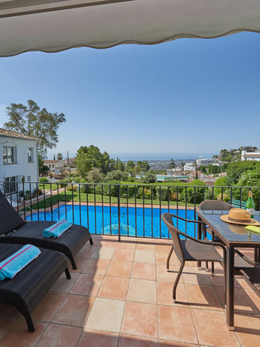 You have your own private terrace with sun shade and seating that overlooks the pool and gardens. Although the pool is shared it never gets busy. The terrace has small table & chairs and two quality sun beds ... a great place to relax and read a book. The property overlooks the communal pool with stunning views to the coast.