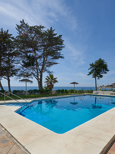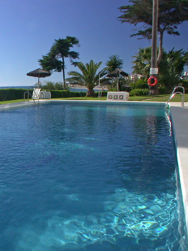 This modern front line apartment has fabulous views across the pool and garden towards the Mediterranean .... on a clear day you can see all the way to Africa in the far distance.