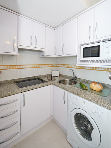 There is a fully fitted compact kitchen with electric hobs, microwave, fridge with freezer compartment and washing machine.