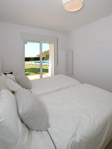 Bedroom 1: This air-conditioned bedroom has 2 x single beds, direct access to the pool and gardens and has an en suite bathroom that has a bath with a shower-over-the-bath, wc and basin.