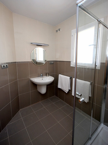 Back to the hallway, down a half a flight of steps leads to 3 more bedrooms. Two twin bedded rooms each with an en suite shower-room, wc & basin. One of the twins overlooks the pool & has it's own terrace. The 3rd bedroom has a double king size bed & an en suite shower-room. This bedroom also benefits from having it's own private terrace that overlooks the pool area. Down another half flight of stairs leads to the utility room that has a washing machine, iron & ironing board.