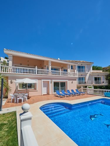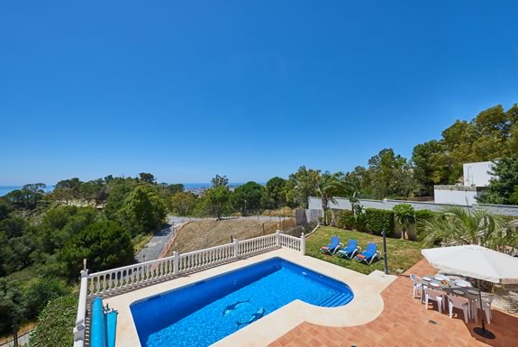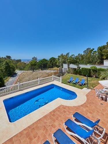 This south facing villa has open panoramic views towards the Mediterranean & Africa in the far distance. The large covered terrace is gated from the main pool area making it safe and easy to keep an eye on young children. For al fresco dining there is an outdoor dining table & webber bbq conveniently located just outside the kitchen. The heated pool (approx. 8m x 5m) with child friendly Roman style steps is great for family fun all year round. There are plenty of sun beds for you to rest and relax whilst enjoying the Spanish sun.