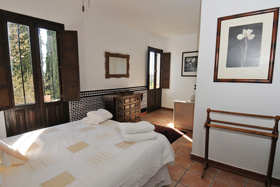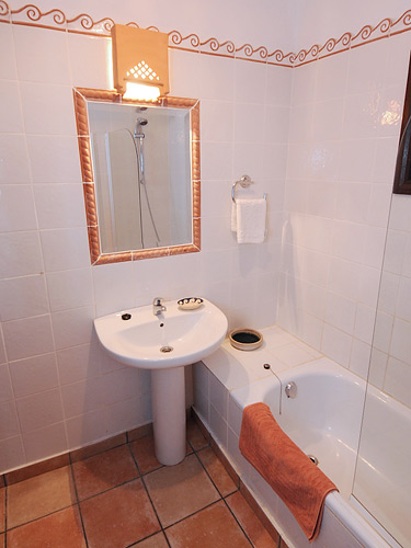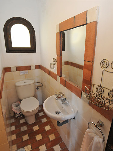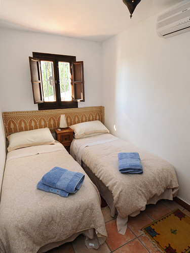 On the ground floor is the large master bedroom (queen size bed) which has a lovely old headboard made from an old reja that came from Malaga - see if you can spot the bullet holes from the Spanish Civil war! The master bedroom has an en-suite shower-room with a walk-in shower, wc & basin. Also on the this floor is a twin bedded room with a bathroom across the hallway which has a bath with a shower over the bath, wc & basin.