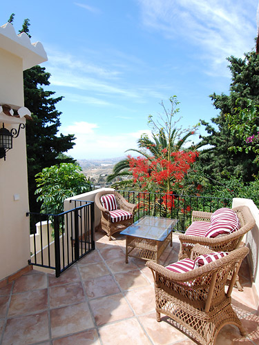 Overlooking the pool & gardens is a lovely shaded terrace which is stylishly furnished with rattan sofas & armchairs ... a perfect place to relax on a balmy summer evening sharing a glass of Rioja with your friends and family whilst cooking the 'gambas' on the BBQ. Or perhaps you might prefer to read a book or just simply day-dream of your next visit to Villa Bancales!
