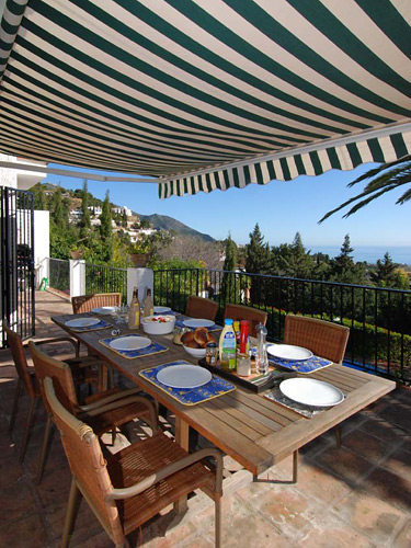 - Shaded terrace with dining table